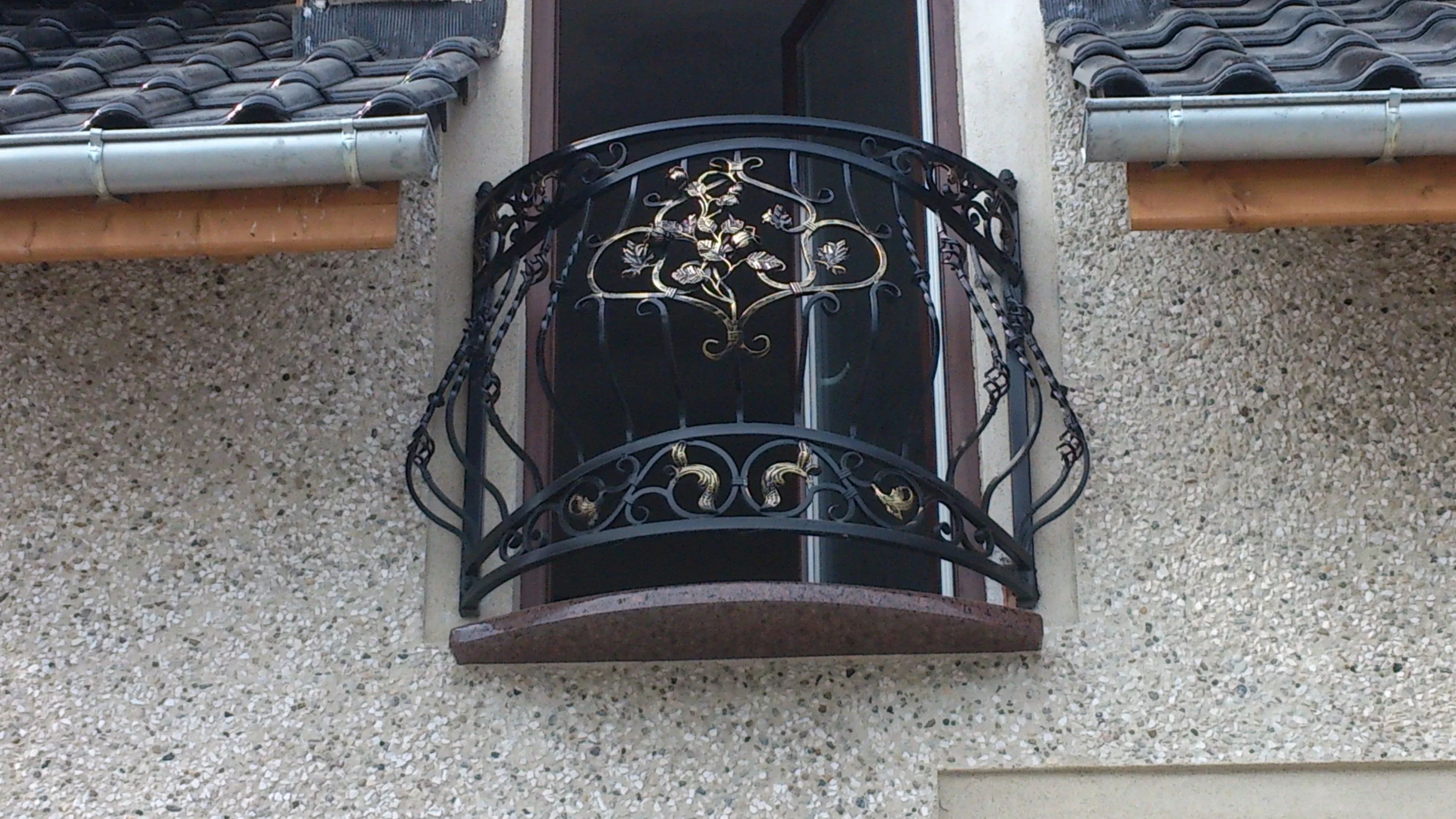 Misterna barierka do okna balkonowego o charakterystycznym wypukłym kształcie. Bogate zdobienia roślinne i złota patyna tworzą luksusowy detal elewacji.