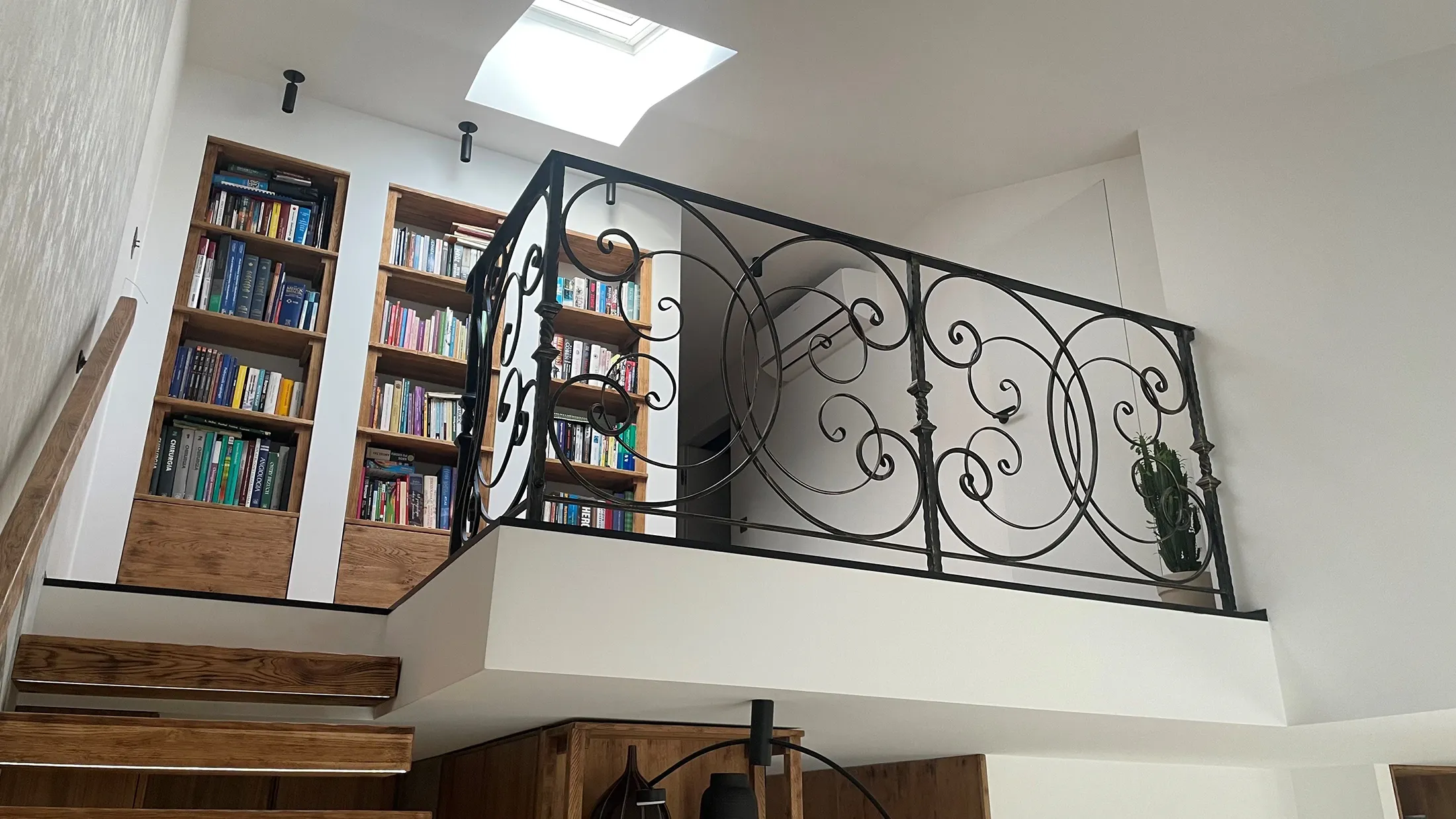 Pełna realizacja balustrady, która definiuje przestrzeń górnej kondygnacji, łącząc bezpieczeństwo z niezaprzeczalnym urokiem kowalstwa artystycznego.