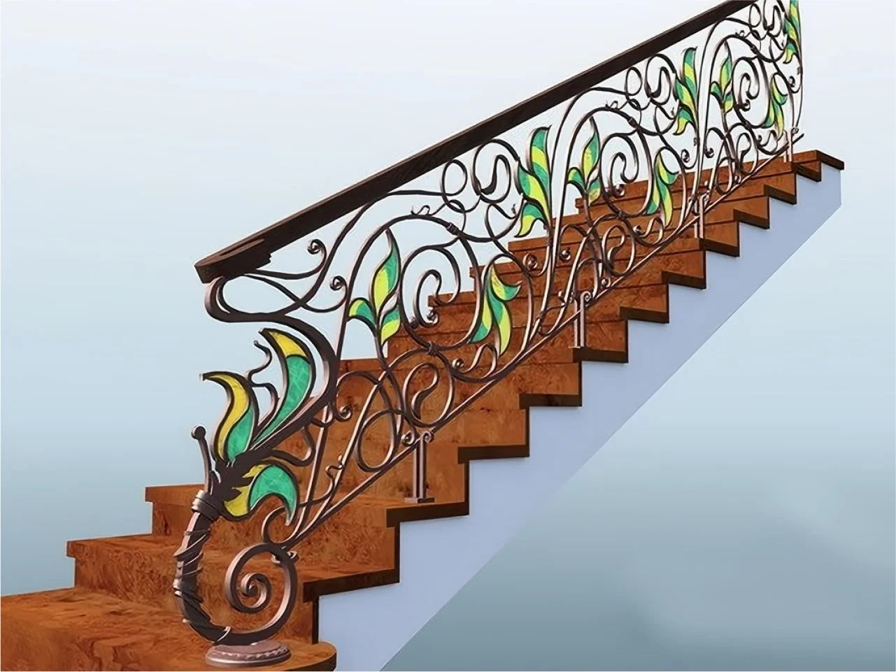 Pełna realizacja balustrady, gdzie płynne, organiczne linie metalu harmonizują z drewnianymi stopniami. Witrażowe liście wprowadzają do wnętrza element koloru i artystycznego nieładu.