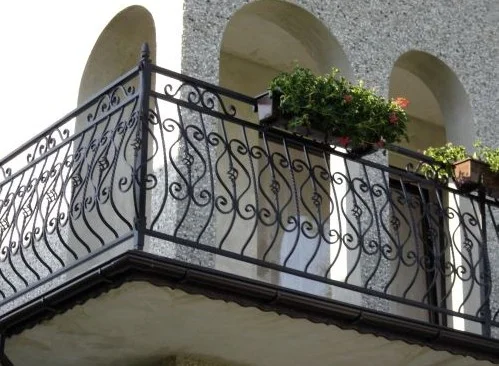 Tradycyjna balustrada balkonowa wykonana z płaskowników giętych w kształt esownic (tzw. brzuszki). Jest to jeden z najpopularniejszych i najbardziej eleganckich wzorów balkonowych, tutaj wzbogacony o uchwyty na skrzynki kwiatowe.