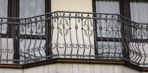 Realizacja balustrady zewnętrznej łącząca tradycyjne motywy kowalskie z nowoczesnym wykończeniem w kolorze grafitowym. Wzór oparty na rytmicznych esownicach i skręcanych prętach pionowych.