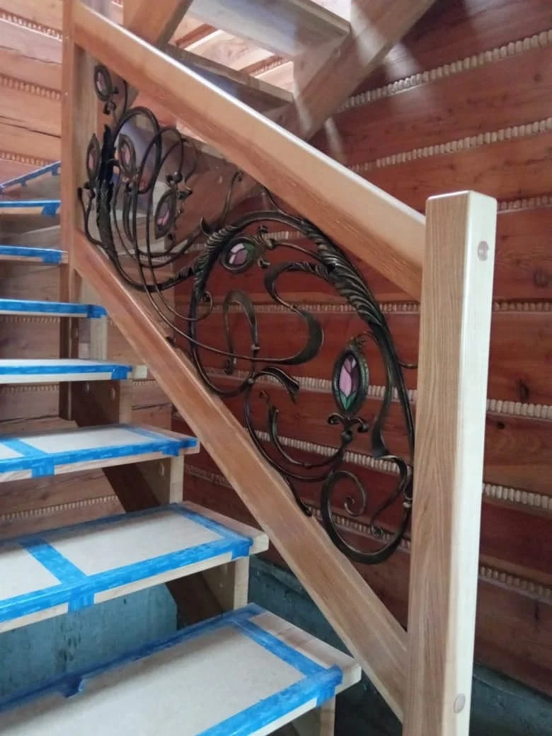 Balustrada schodowa w domu z bali lub drewna. Solidna, drewniana konstrukcja (słupy, poręcz) została wypełniona subtelnymi, kutymi panelami z akcentami witrażowymi. Idealne połączenie stylu rustykalnego z artystycznym.