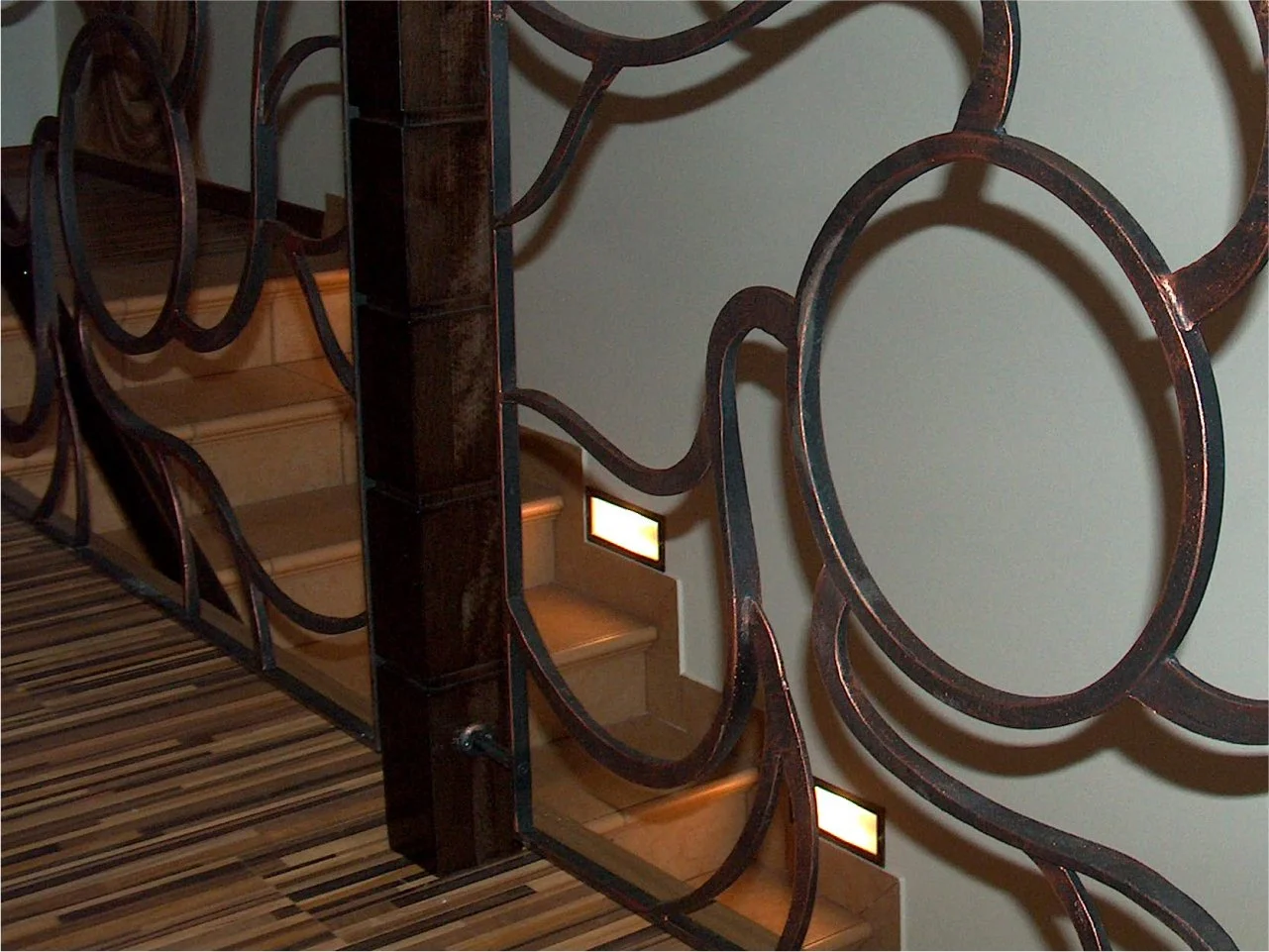 Nowoczesna interpretacja balustrady, gdzie sztywne pręty zastąpiono taśmami metalu o organicznym przebiegu. Ciepły odcień miedzi idealnie komponuje się z nowoczesnym oświetleniem schodowym.