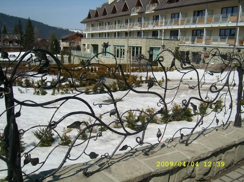 Przykład kowalstwa artystycznego czerpiącego inspirację z natury. Balustrada nie posiada geometrycznych podziałów - pręty wiją się swobodnie jak gałęzie pnącza, przeplatając się i tworząc naturalną barierę. Całość zdobią ręcznie kute liście.