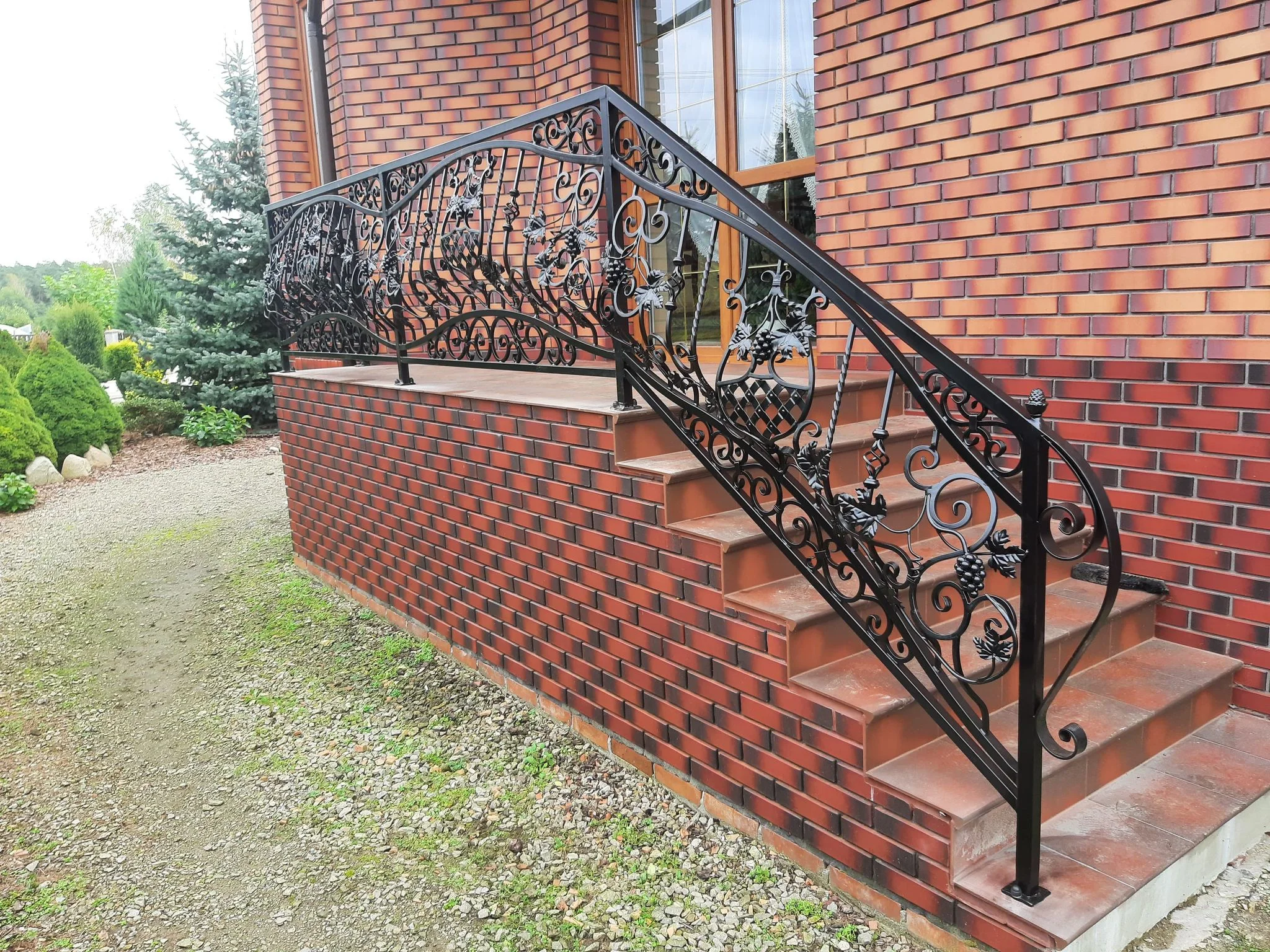 Trudna technicznie realizacja - balustrada wygięta w łuk, zgodnie z biegiem schodów wachlarzowych. Wzór roślinny (winorośl) został płynnie dopasowany do krzywizny konstrukcji.