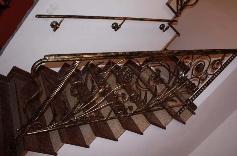 Prezentujemy **balustradę schodową** utrzymaną w stylistyce pałacowej. Ciemny podkład został ręcznie przetarty złotą patyną, co wydobywa trójwymiarowość kutych liści i kwiatów.