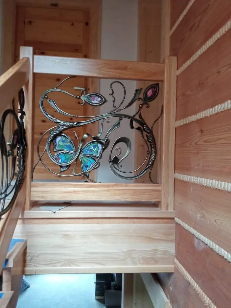 Prezentacja gotowej realizacji. Jasne drewno stopni i policzków stanowi tło dla ciemnej, patynowanej stali i kolorowych witraży. Balustrada nie przytłacza wnętrza, lecz nadaje mu lekkości i artystycznego wyrazu.
