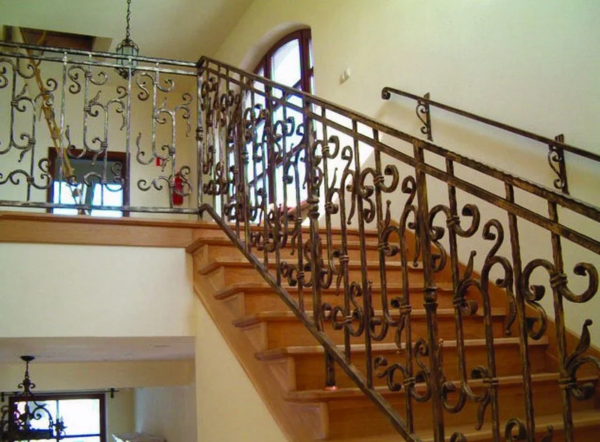 Klasyczna balustrada, w której czarny mat stali został dyskretnie podkreślony złotą patyną. Ręcznie wykonane elementy ozdobne nadają schodom ciepłego, eleganckiego charakteru.