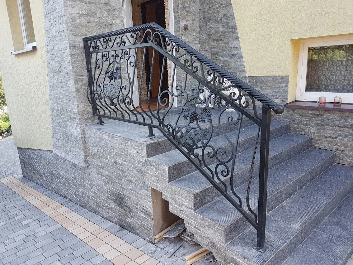 Zewnętrzna barierka wejściowa zdobiona motywem kosza z winogronami. Solidne wykonanie i artystyczny detal.