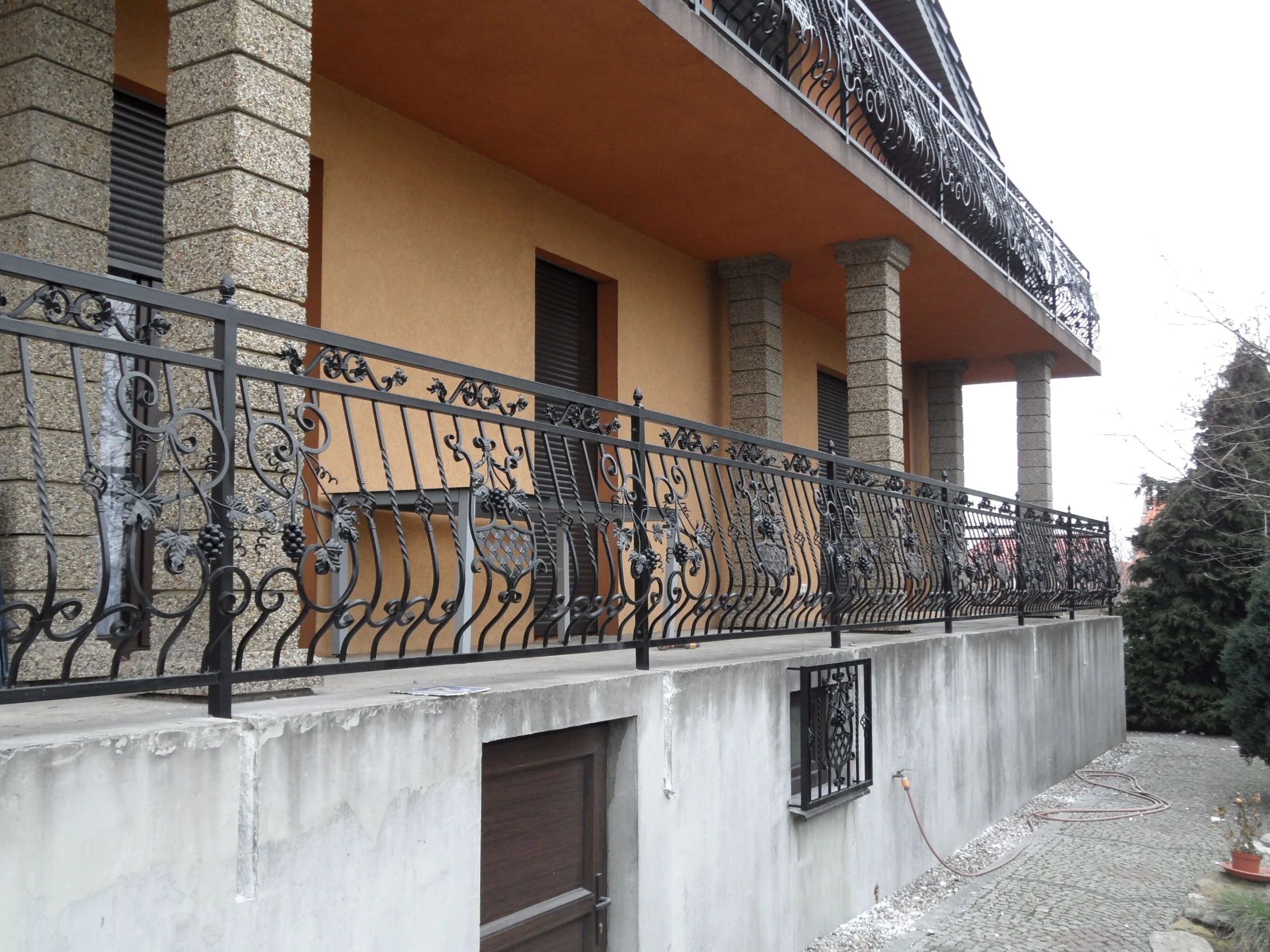 Widok z boku na czarną kuta balustradę. Trwałość stali połączona z finezją roślinnego ornamentu.