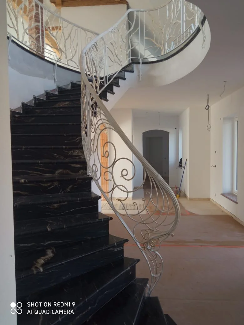 Reprezentacyjna balustrada schodowa wykonana z dbałością o każdy szczegół. Kontrast między czarnym marmurem schodów a jasną balustradą tworzy efekt WOW.