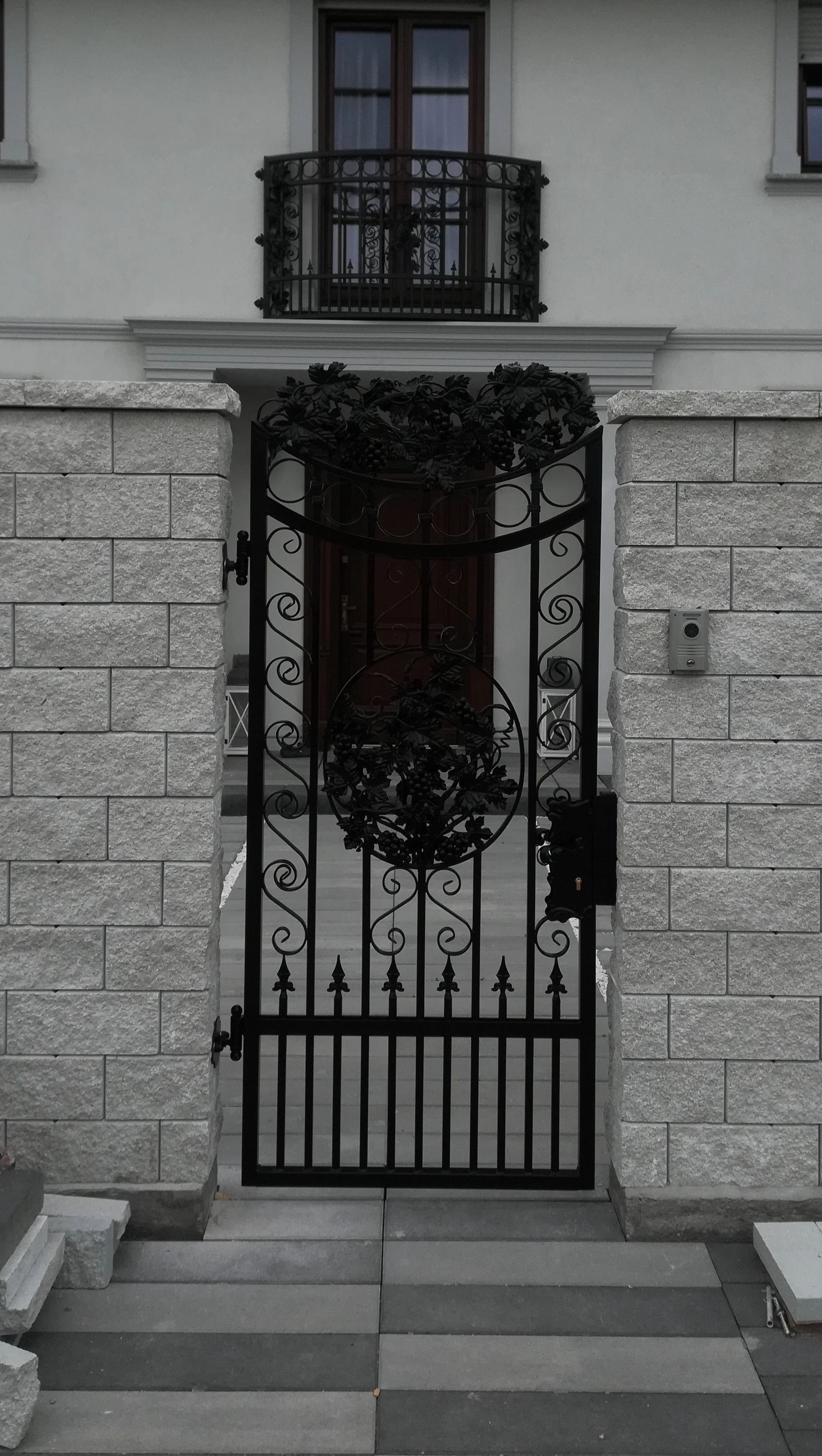 Spójna realizacja furtki wejściowej oraz balustrady balkonowej z tym samym motywem winorośli. Elegancja i harmonia w architekturze domu.