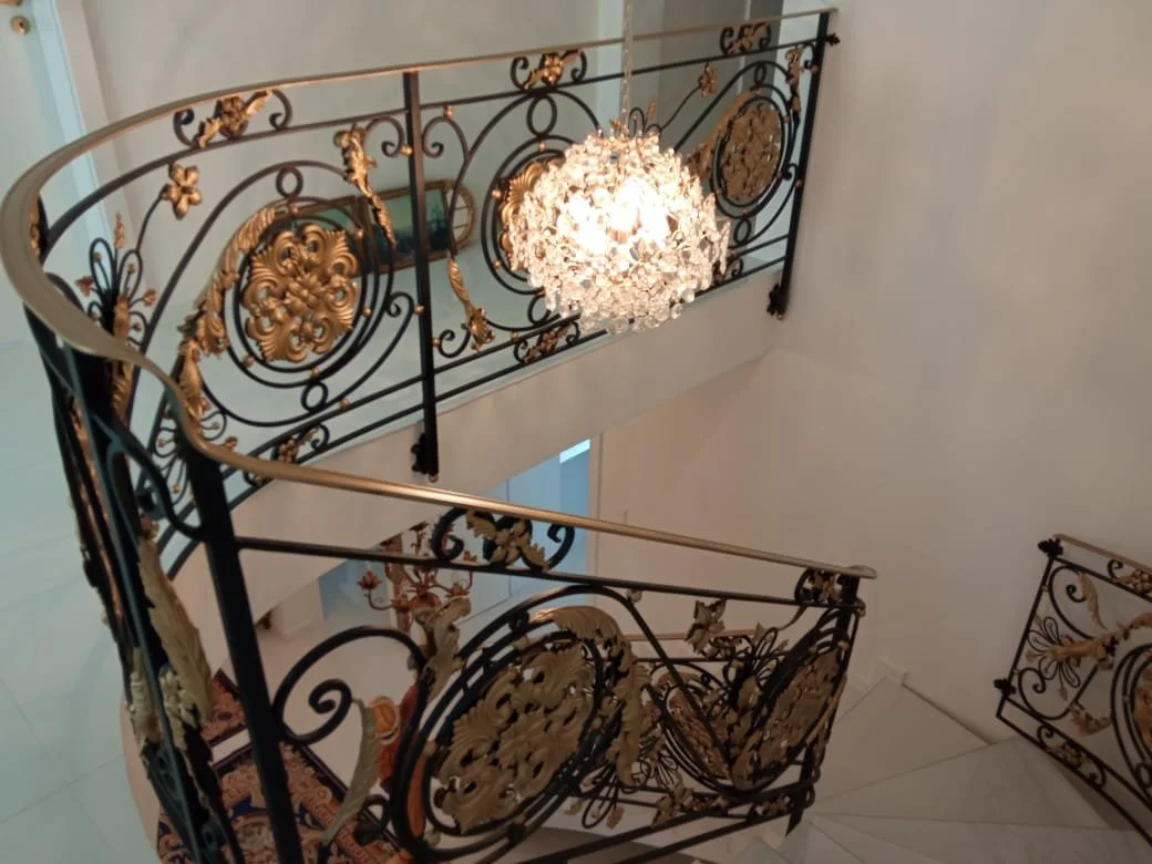 Balustrada kuta o płynnych, krzywoliniowych kształtach, idealnie dopasowana do architektury schodów. Złocone elementy liściaste dodają całości prestiżowego wyglądu.