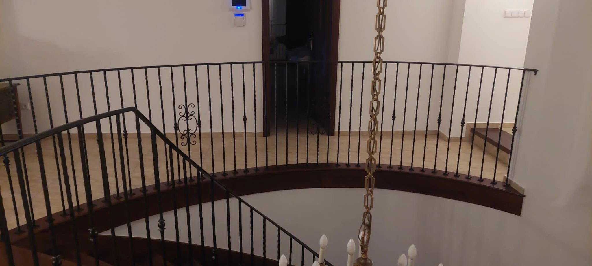 Przykład wykonania balustrady o łukowej linii. Idealne dopasowanie do geometrii schodów i stropu.