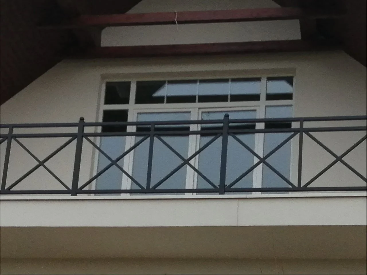 Prosta i elegancka balustrada na taras o wzorze krzyżowym. Matowa czerń nadaje budynkowi nowoczesnego i schludnego wyglądu.