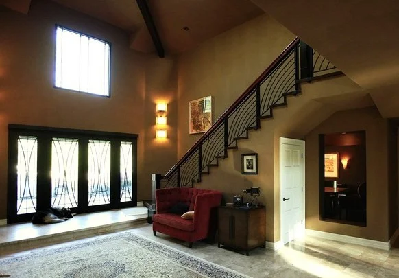 Lekkie wizualnie schody z kuta barierką o dynamicznym wzorze łuków. Idealne rozwiązanie do otwartych salonów.
