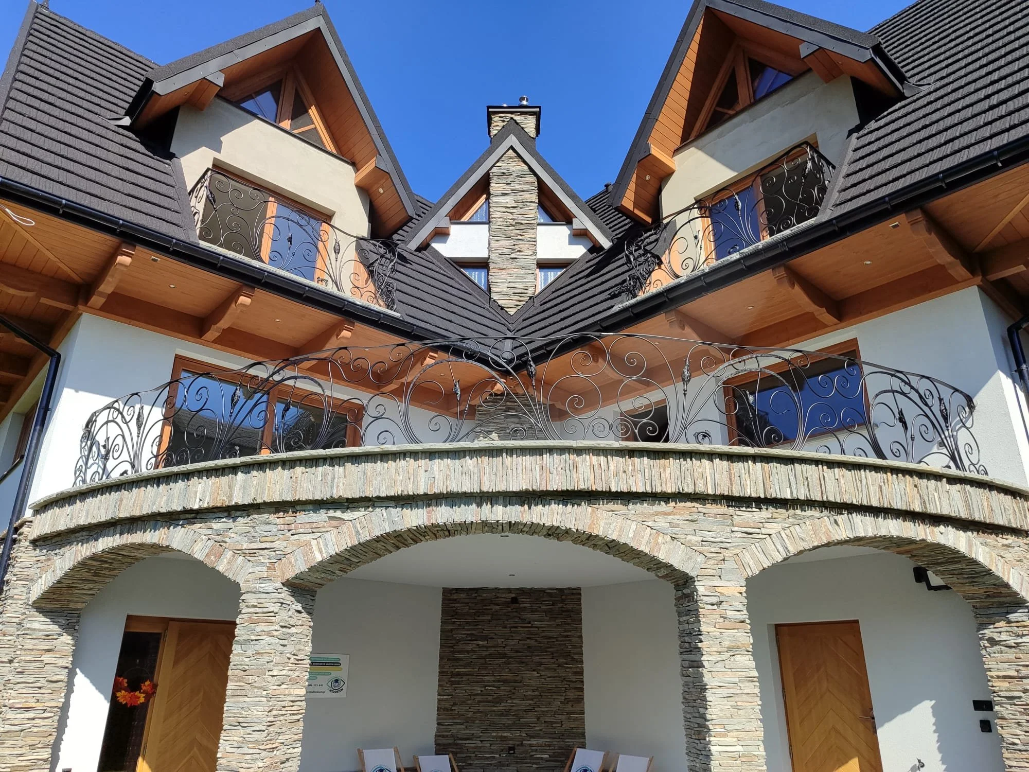 Szerokie ujęcie budynku z zainstalowanymi kuty mi balustradami. Kompletna realizacja podkreślająca styl i status właściciela.