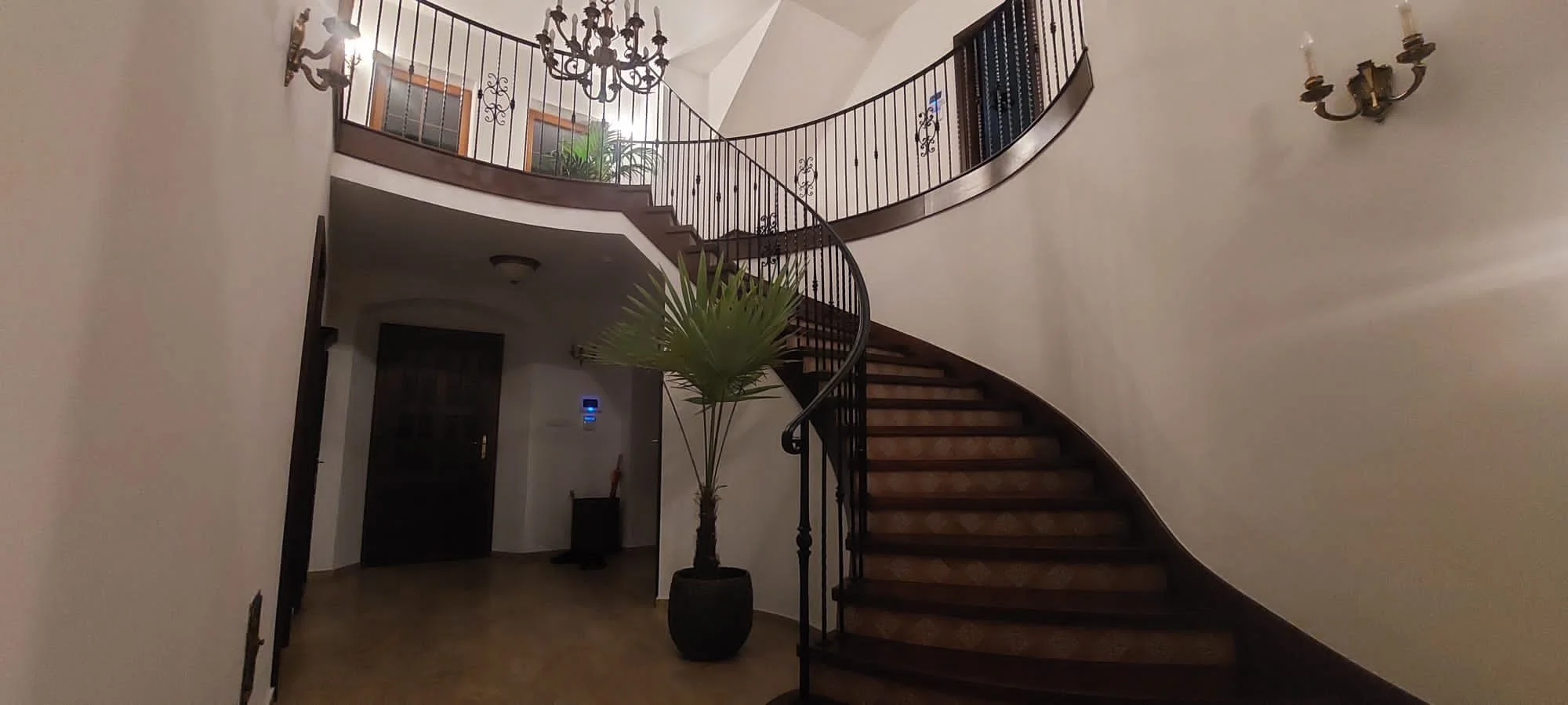 Szeroki widok na reprezentacyjne schody. Balustrada kuta dodaje wnętrzu lekkości i szlachetnego charakteru.