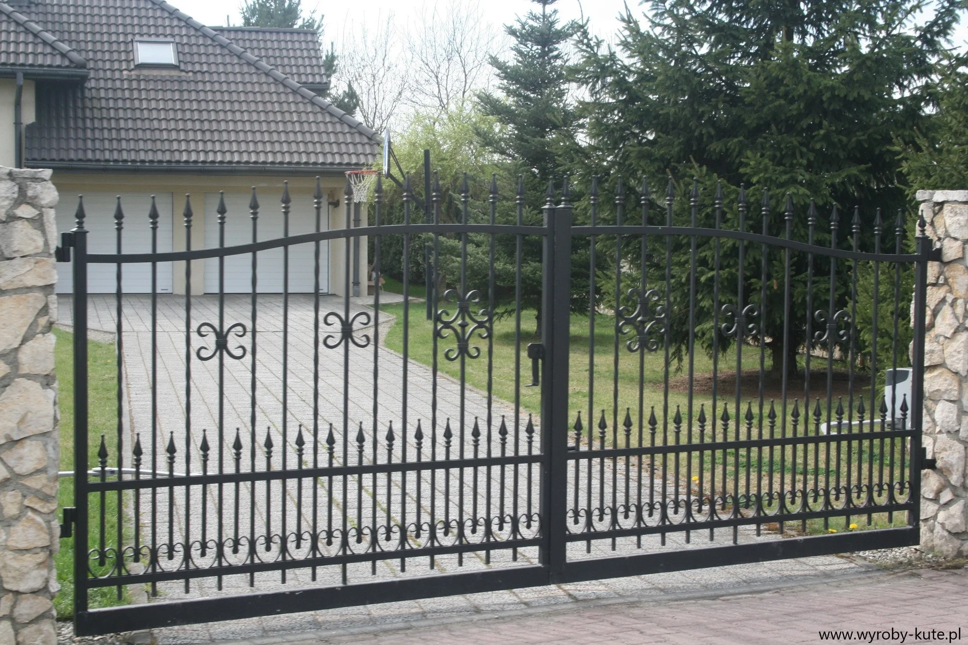 Elegancka w swojej prostocie brama dwuskrzydłowa. Konstrukcja oparta na pionowych profilach zwieńczonych ostrymi grotami. W centralnej części każdego skrzydła znajduje się delikatny element dekoracyjny przypominający motyla lub literę X.