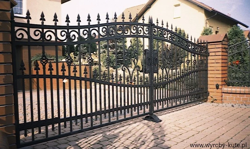 Brama o ponadczasowym wzornictwie. Proste, pionowe podziały zostały urozmaicone delikatnym łukiem górnym oraz subtelnymi elementami dekoracyjnymi w centralnej części skrzydeł (motyw diamentu/rombu).