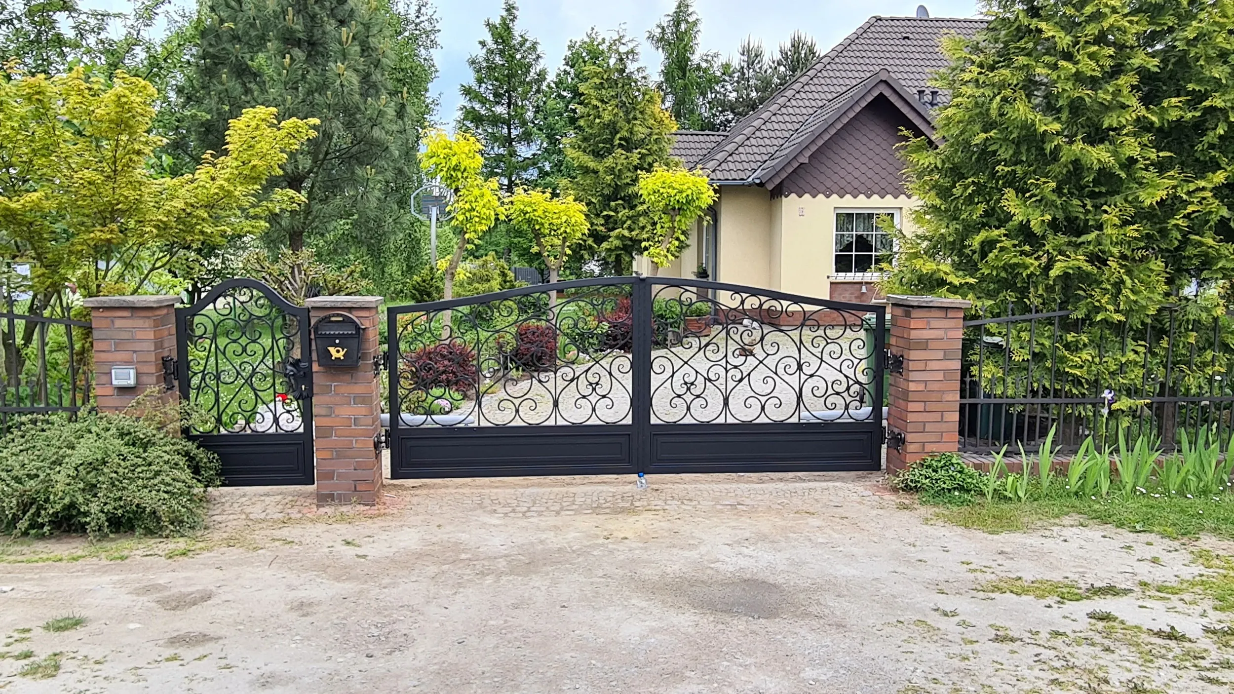Tradycyjna brama kuta o łukowym zwieńczeniu, bogato zdobiona kowalskimi detalami. Solidna konstrukcja zapewniająca bezpieczeństwo i estetykę.