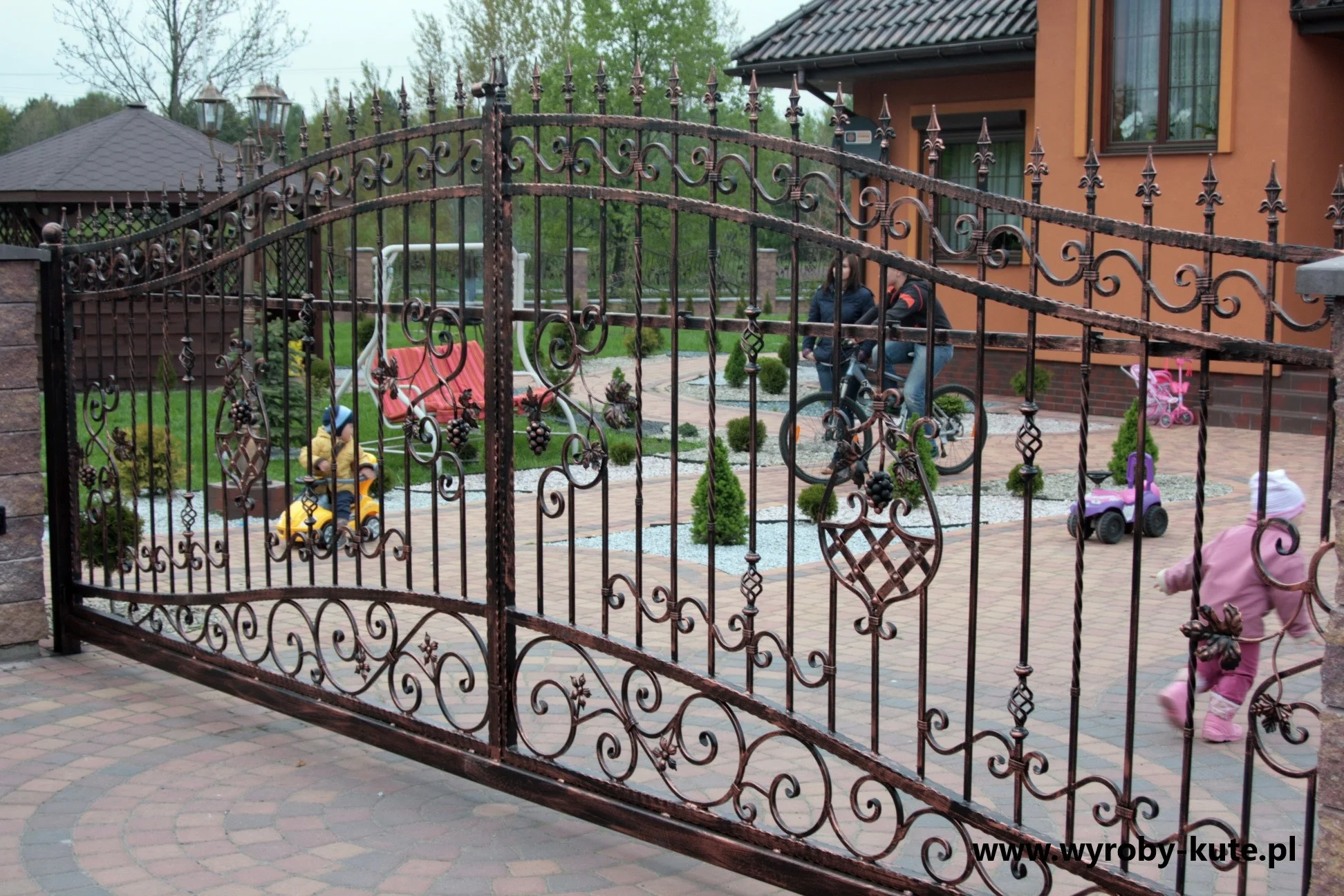 Zdjęcie w kontekście użytkowym - brama jako element codziennego życia rodziny. Klasyczna dwuskrzydłowa konstrukcja z motywem winorośli, pomalowana na kolor brązowy z patyną, tworzy ciepłe i przyjazne wejście.
