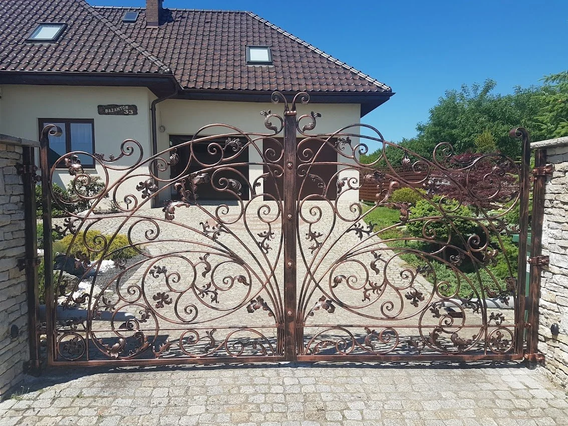 Ta sama brama w wersji z miedzianą patyną. Wykończenie to wydobywa głębię kucia i nadaje ogrodzeniu antyczny charakter.