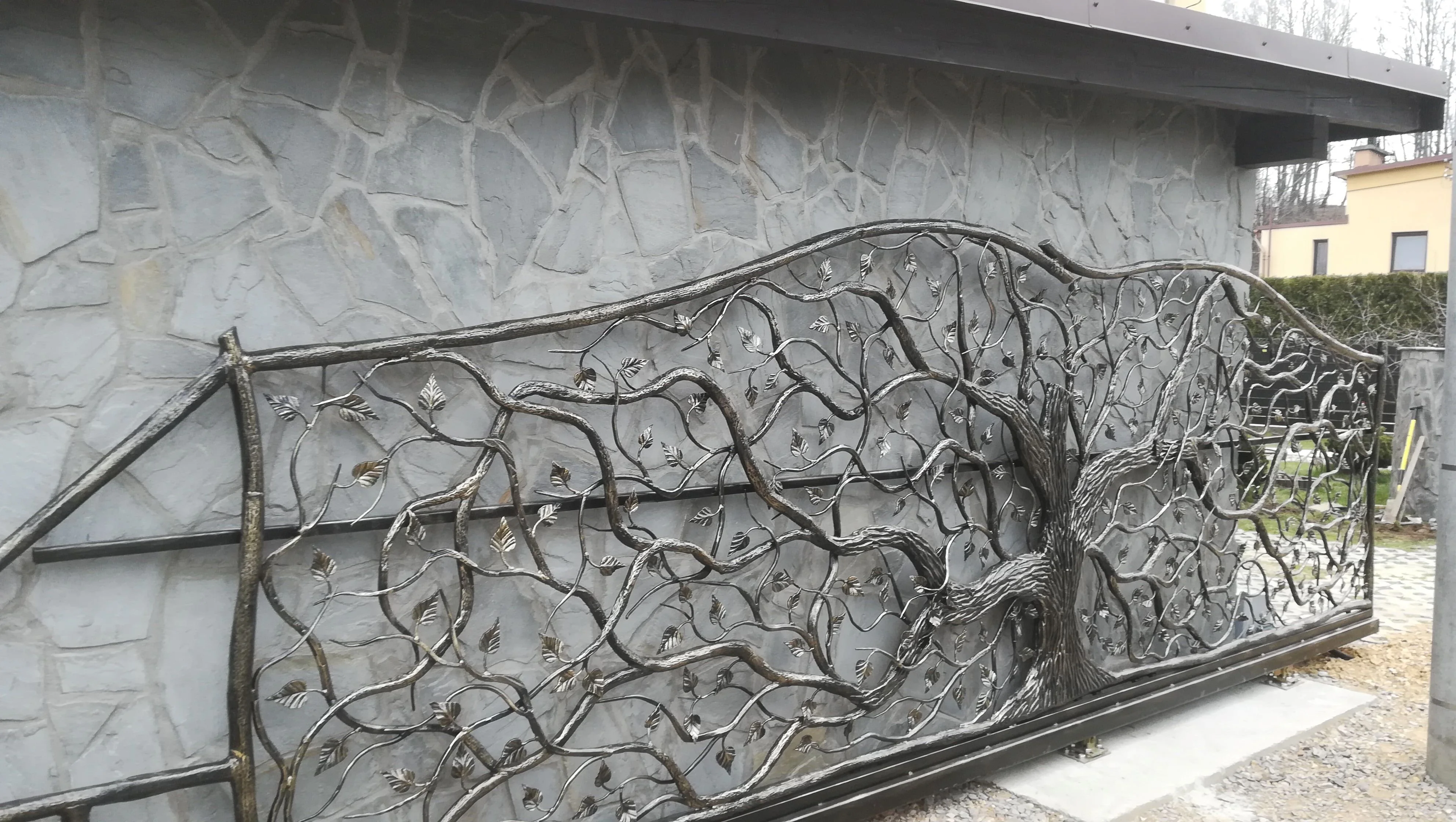 Połączenie tradycyjnego kowalstwa z nowoczesną techniką. Brama wyposażona w napęd, zapewniająca komfort i bezpieczeństwo.