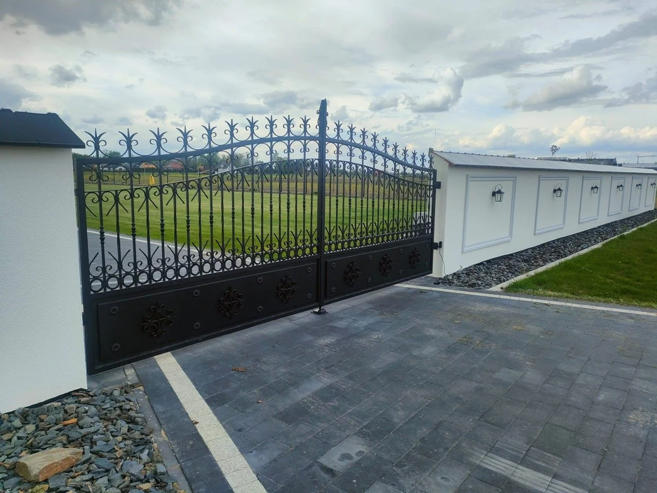 Solidna i reprezentacyjna brama dwuskrzydłowa, będąca idealnym zabezpieczeniem dla posesji w stylu tradycyjnym.
