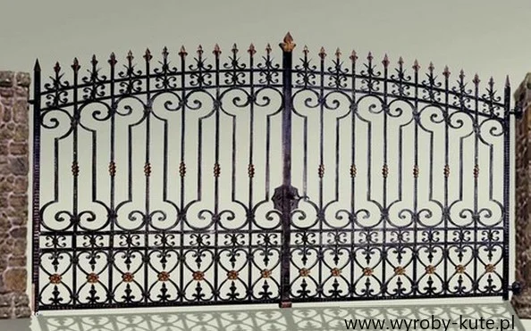Brama wjazdowa o klasycznym podziale. Dolna część została zagęszczona elementami w kształcie serc, a miejsca przecięcia prętów ozdobiono złotymi kwiatkami (rozetkami), co dodaje biżuteryjnego charakteru.