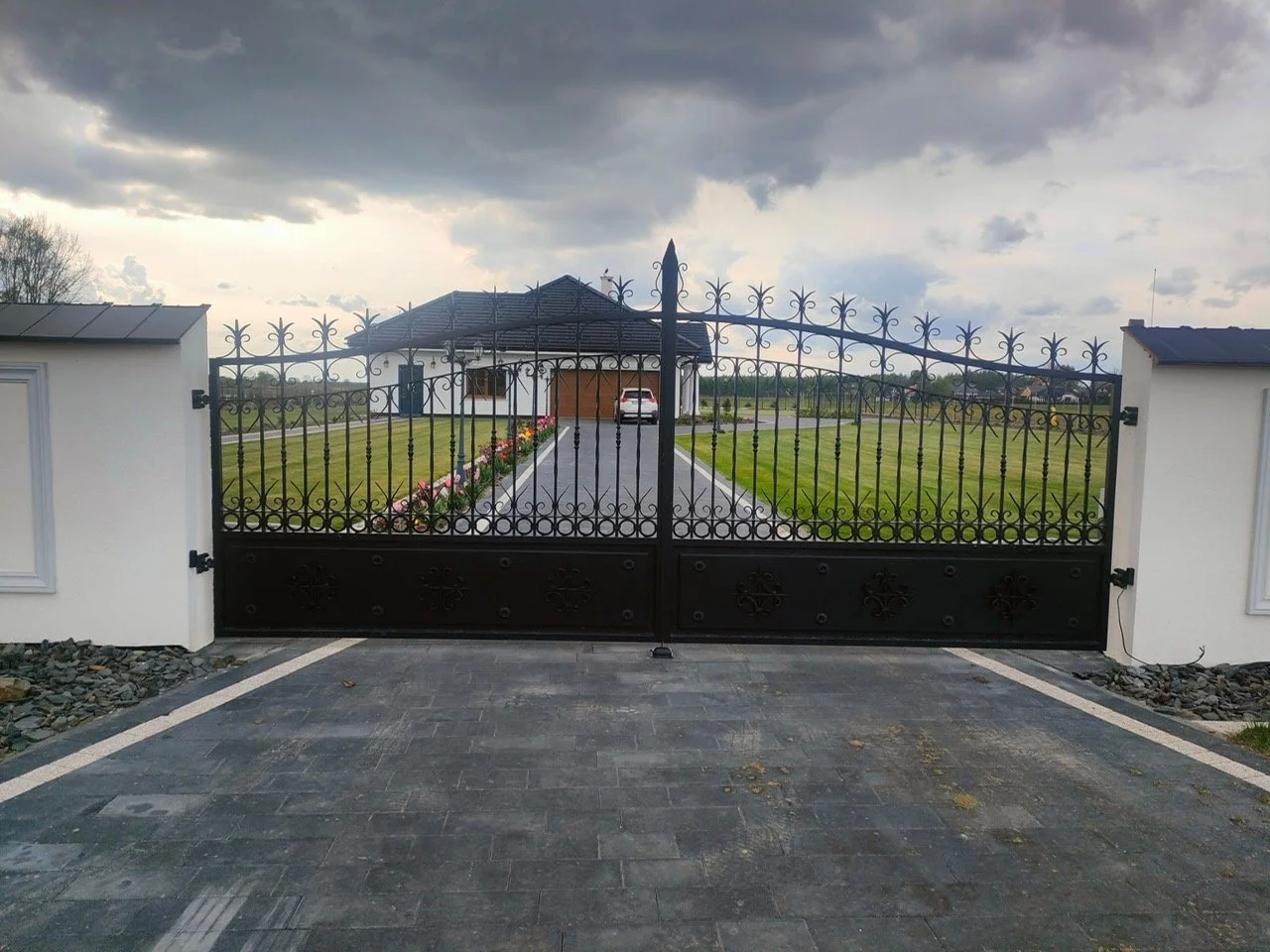 Widok frontowy na bramę, która wyznacza wyraźną i stylową granicę między przestrzenią publiczną a prywatną posesją.