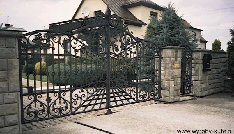 Brama o masywnej konstrukcji, sprawiająca wrażenie niezniszczalnej. Dolna ćwiartka wypełniona gęstą kratownicą, co zwiększa sztywność i chroni przed drobnymi zwierzętami. Góra ozdobna, kuta.