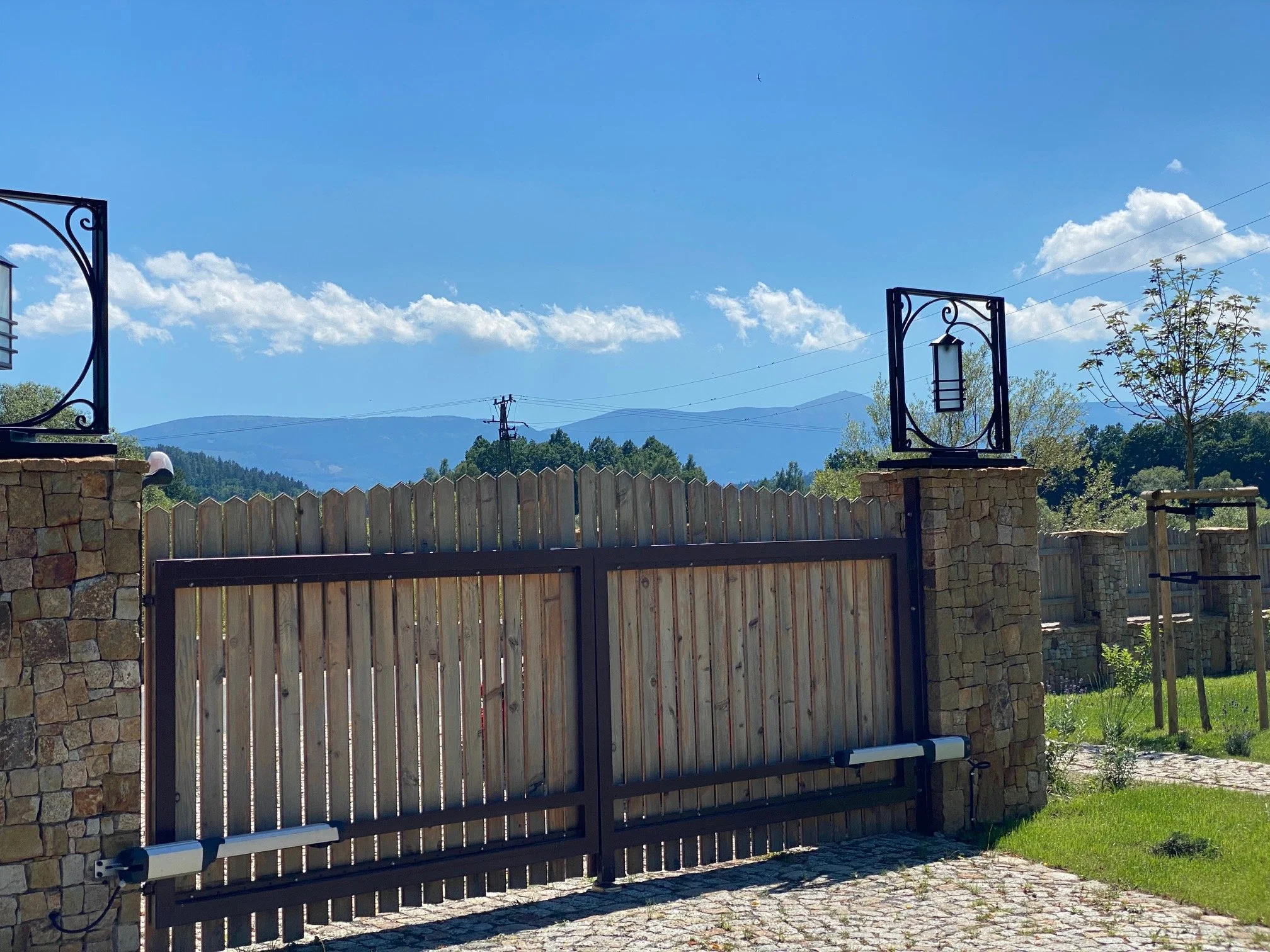 Brama kuta metal i drewno - górski krajobraz