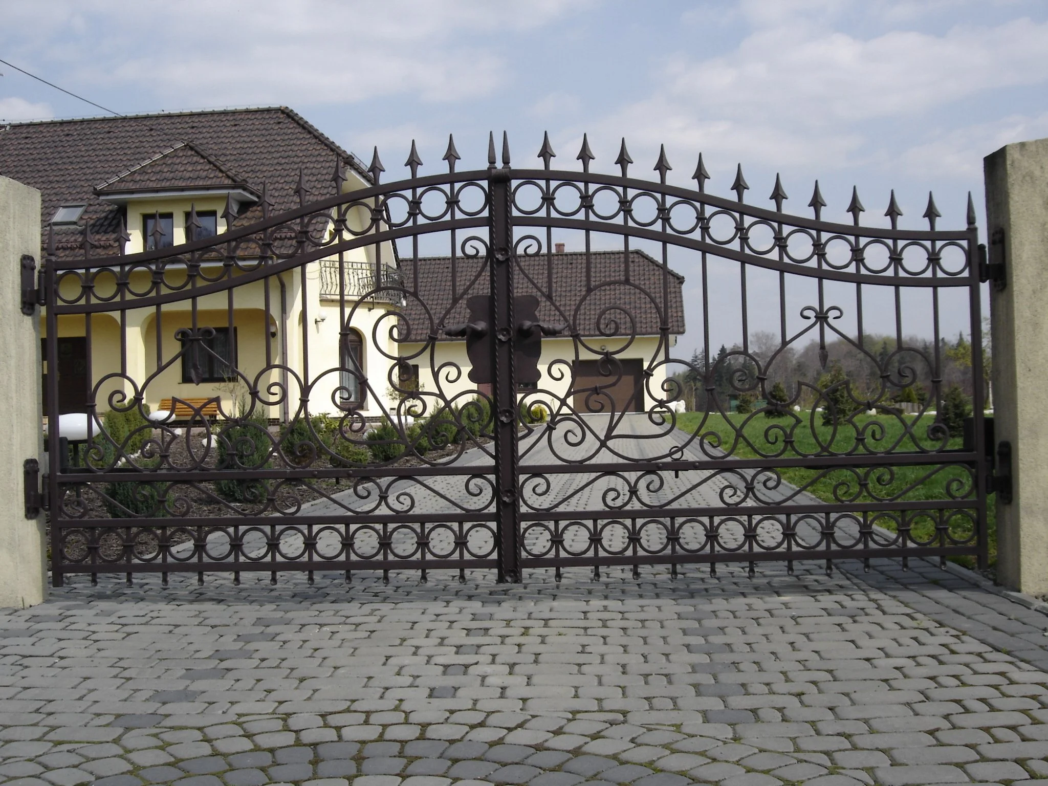 Klasyczna brama wjazdowa wykończona brązową patyną. Wyjątkowy wzór, który wyróżnia się na tle elewacji domu.