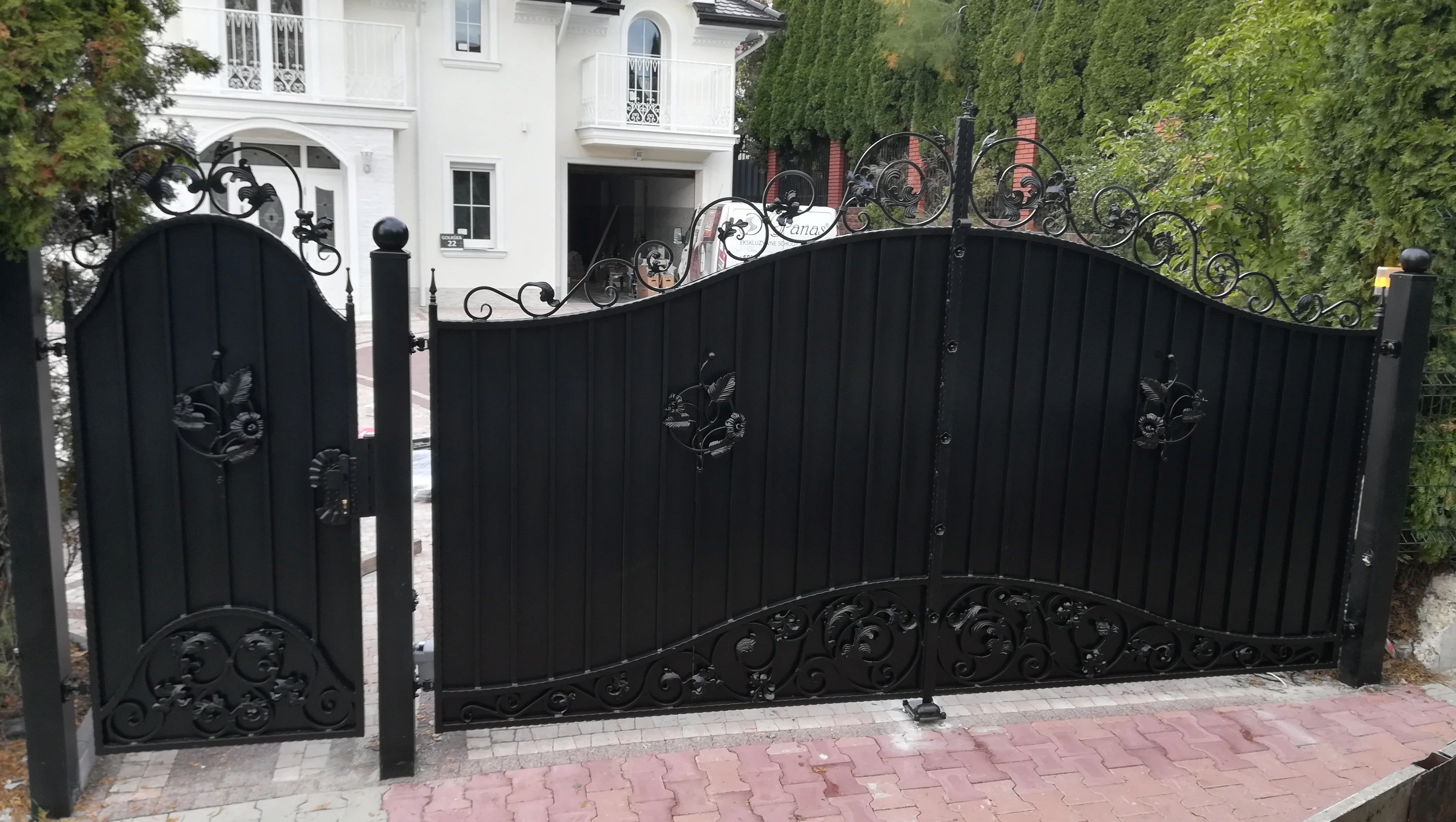 Imponująca, wysoka brama o pełnym wypełnieniu blachą pionową. Zdobiona kutymi esownicami i liśćmi, zapewnia 100% prywatności.