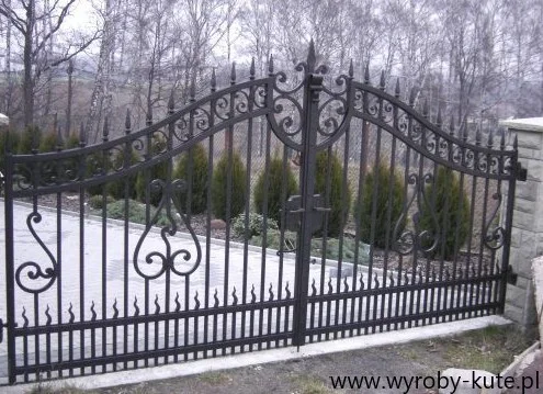 Lekka optycznie brama wjazdowa, w której głównym motywem dekoracyjnym są elementy w kształcie odwróconych serc lub lir, wkomponowane w pionowe pręty. Całość zwieńczona rzędem ostrych grotów.