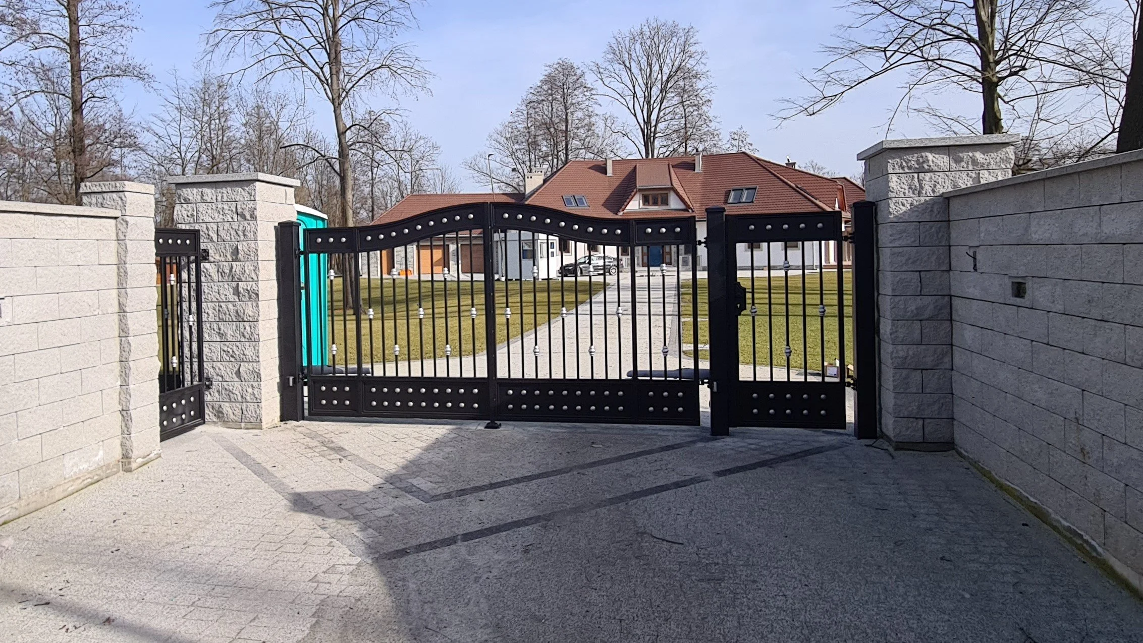 Nowoczesna interpretacja klasycznej bramy kutej. Dolny pas z perforacją i łukowe zwieńczenie tworzą unikalny, neoklasyczny styl ogrodzenia.