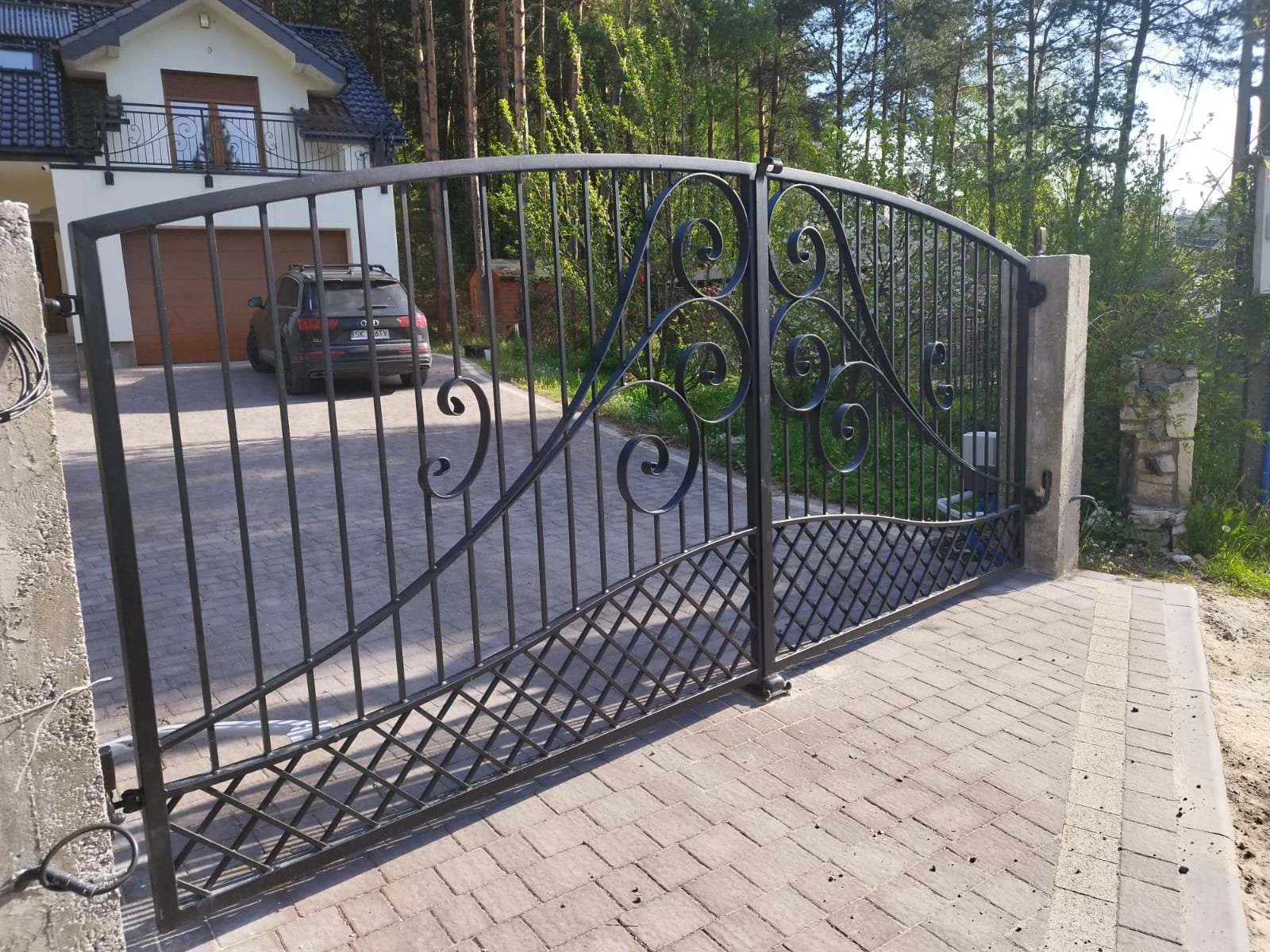 Brama wjazdowa o łagodnym łuku, charakteryzująca się gęstym wypełnieniem w dolnej części w formie kraty karo. Górna część zdobiona eleganckimi esownicami.