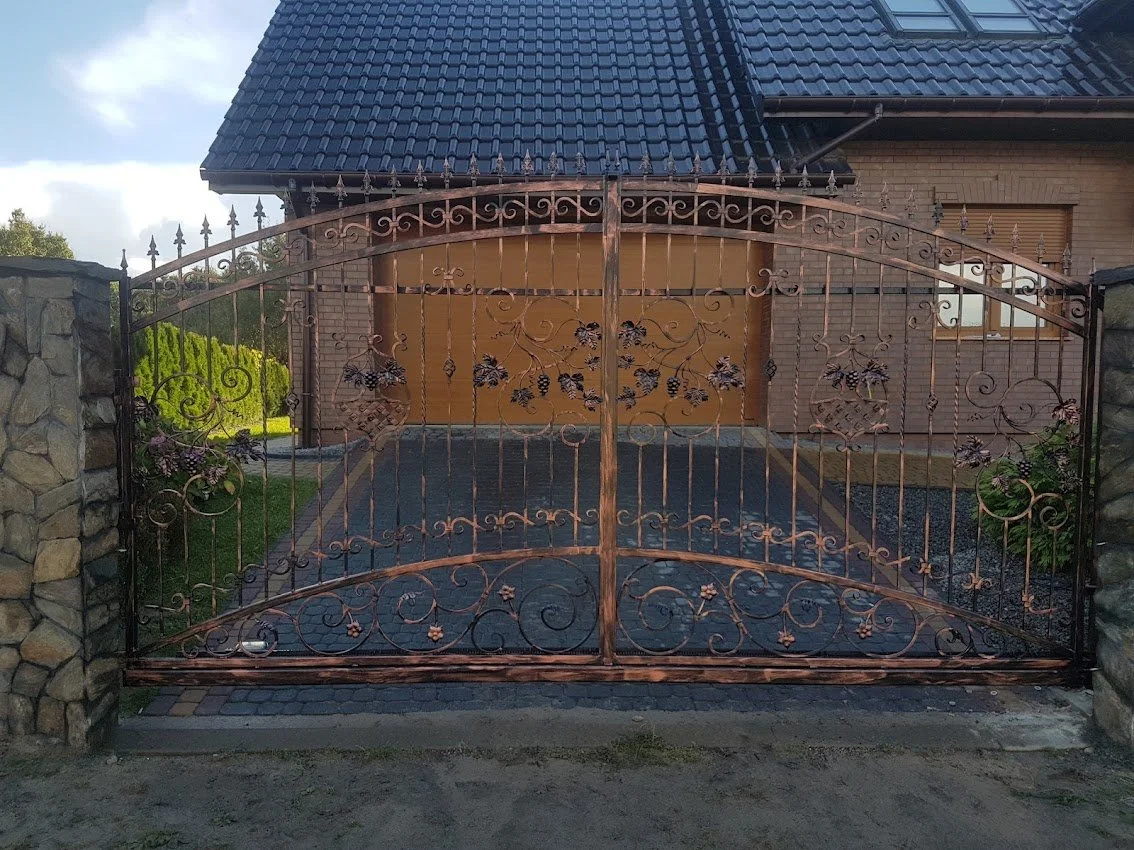 Reprezentacyjna brama wjazdowa z gęstym kuty m wzorem winorośli, wykończona efektowną miedzianą patyną.