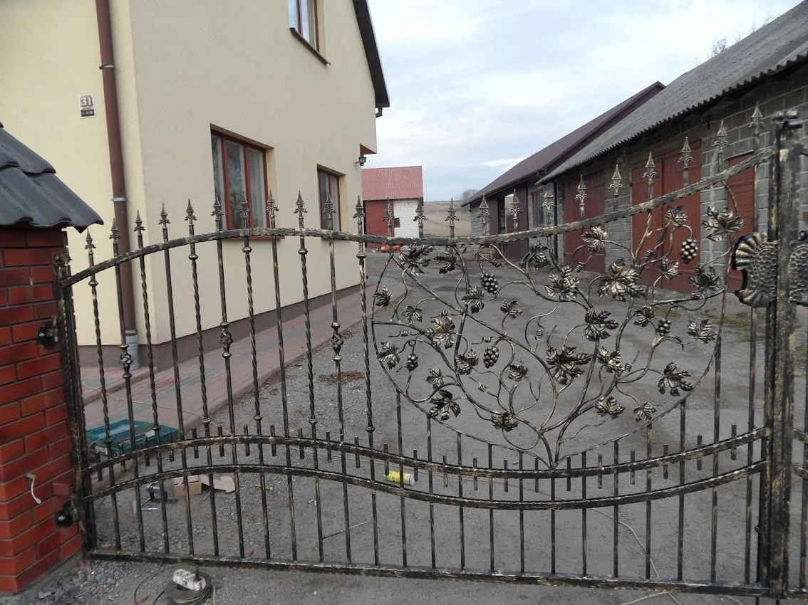 Bogato zdobiona brama wjazdowa z motywem winorośli. Złota patyna podkreśla trójwymiarowość kuty ch liści i gron.
