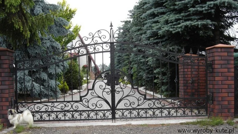 Brama o imponujących gabarytach, zapewniająca poczucie bezpieczeństwa i majestatu. Górna linia mocno wygięta w łuk. Wypełnienie oparte na grubych prętach i dużych, spiralnych elementach (esownicach).