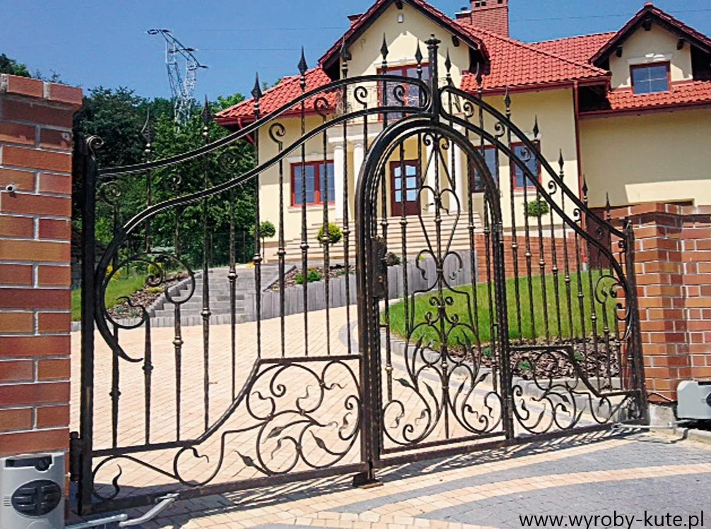 Ciekawa konstrukcja kowalska. Brama posiada dodatkowe, wewnętrzne skrzydło (furtkę?) lub jest to brama niesymetryczna z funkcją furtki. Całość bogato zdobiona motywami roślinnymi (liście, pnącza).
