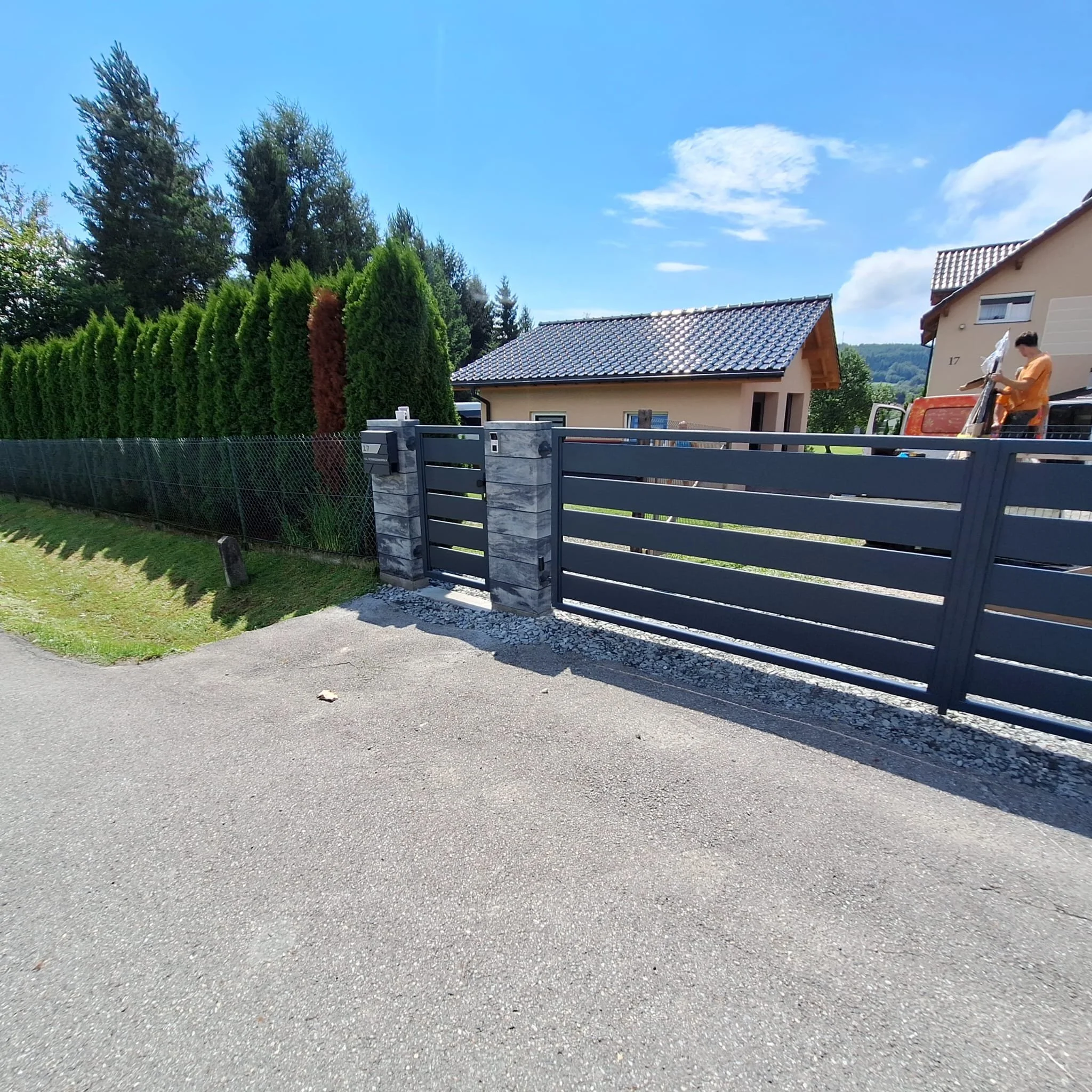 Ujęcie ukazujące pełną linię frontową składającą się z bramy przesuwnej i dopasowanej furtki.
