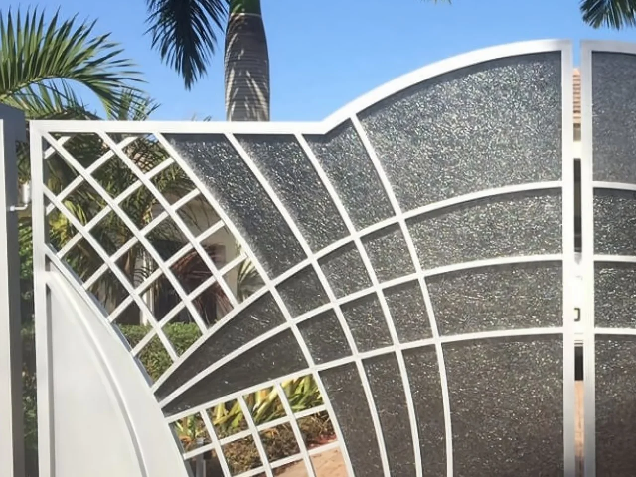 Unikatowy projekt bramy, w której proste linie przecinają się pod różnymi kątami, tworząc dynamiczną kompozycję. Zastosowanie perforowanej blachy zapewnia prywatność, nie tracąc przy tym na nowoczesnym wyglądzie.