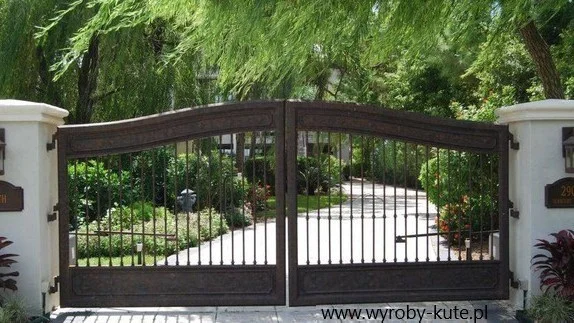Masywna brama wjazdowa o charakterze rezydencjonalnym. Nietypowy kolor (brąz/miedź antyczna) oraz szerokie profile nadają jej powagi. Dolny pas jest pełny, z dekoracyjnymi przetłoczeniami.