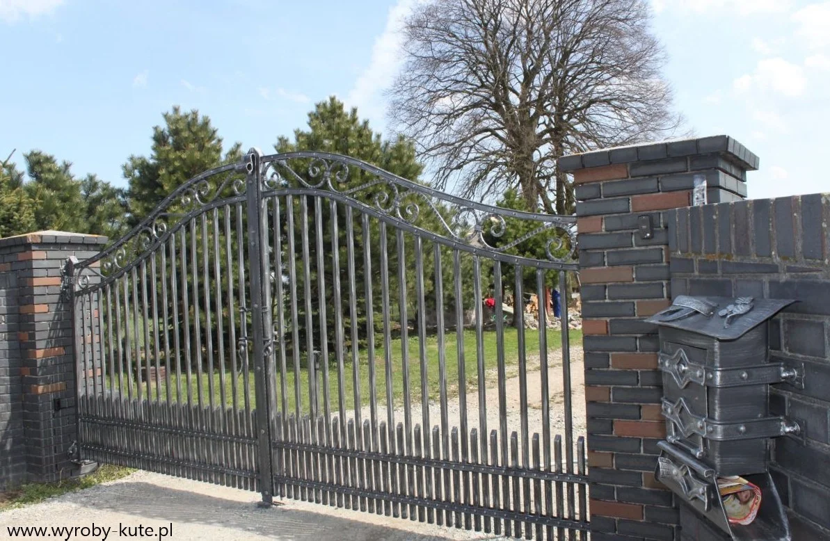 Funkcjonalna brama przesuwna o nienachalnym wzornictwie. Głównym ozdobnikiem jest falista linia górna oraz delikatne esownice pod nią. Obok, na słupku, wisi unikatowa, ręcznie kuta skrzynka na listy.
