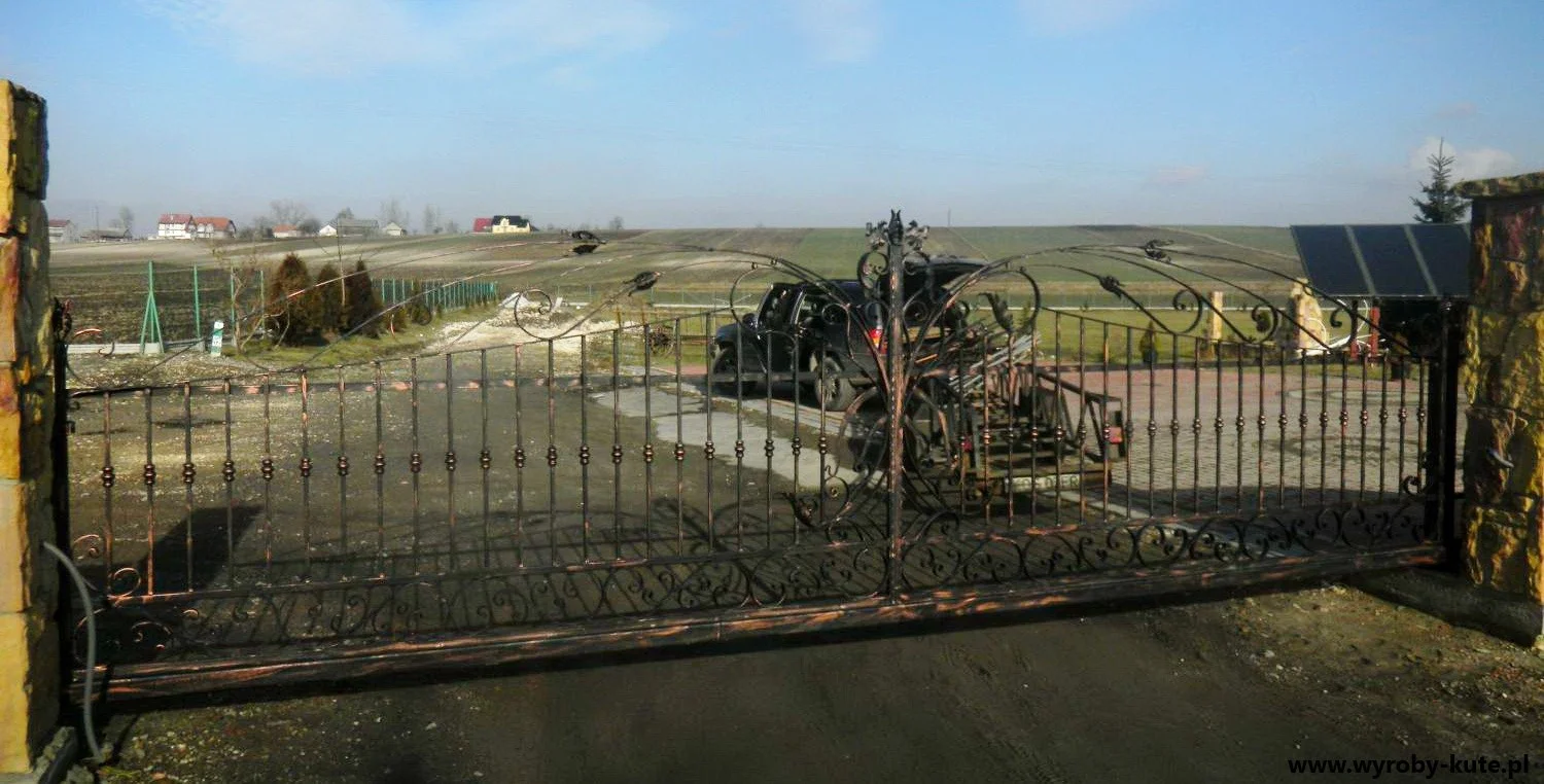 Brama wjazdowa, która jest ozdobą całej okolicy. Wzór naśladuje naturalny układ gałęzi drzewa, na których osadzone są kute listki. Patynowanie na kolor miedzi/złota podkreśla jesienny charakter kompozycji.