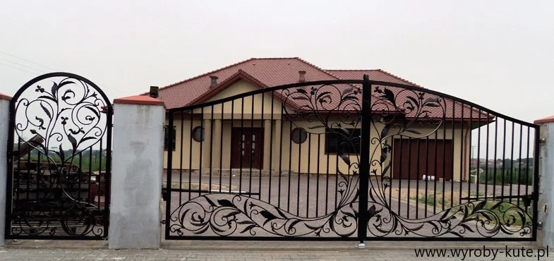 Brama przesuwna o śmiałym wzornictwie. Motywy roślinne są tu potraktowane w sposób nowoczesny - są duże, wyraźne i graficzne. Kompozycja jest asymetryczna, ale zbalansowana.