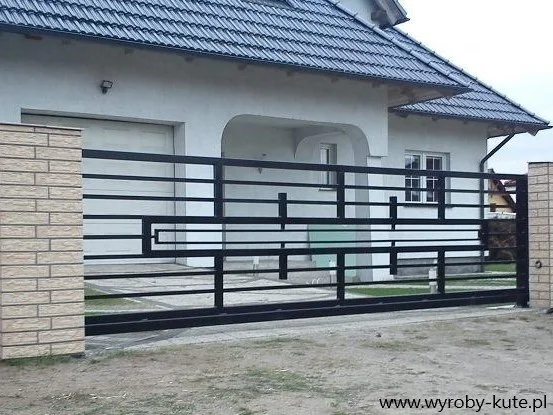 Brama dla miłośników nowoczesnego minimalizmu. Wypełnienie stanowią szerokie pasy ułożone poziomo, przełamane wstawką w kształcie litery U lub prostokąta, co nadaje całości dynamicznego, industrialnego charakteru.