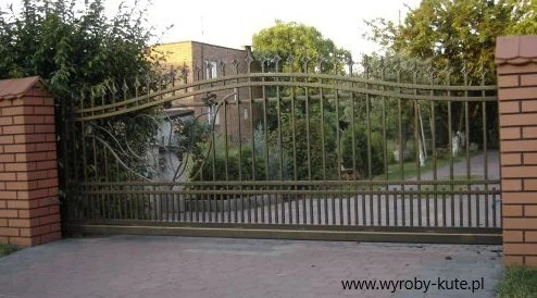 Brama o konstrukcji mieszanej. Dolna część (ok. 1/3 wysokości) jest gęsto zabudowana lub wypełniona blachą, co chroni przed wzrokiem osób postronnych i zwierzętami. Górna część jest ażurowa i ozdobna.